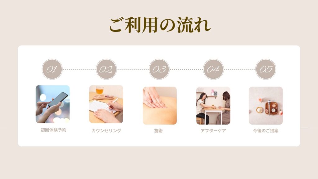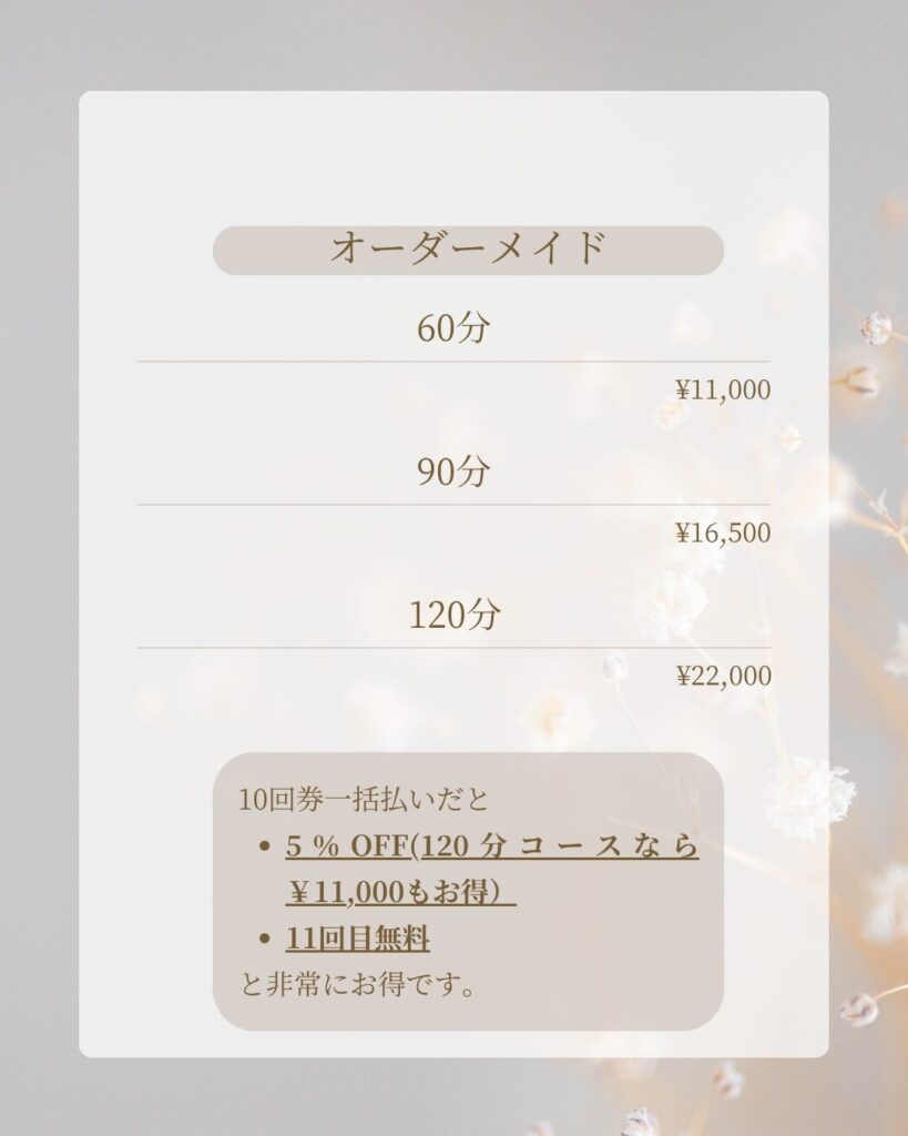 営業時間 | 平日 9:30~17:00(最終受付は16:00) 土曜 9:30~19:00(最終受付は18:00) (時間外の施術をご希望の方はご相談下さい。) |